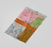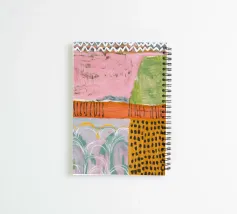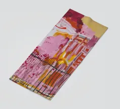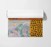 A soft, abstract composition with a patchwork of pastel colors including pink, light green, and orange, with areas of dotted patterns and gentle lines, creating a serene and delicate visual field.