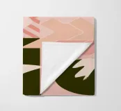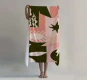 Una composizione moderna e astratta caratterizzata da un patchwork di vari motivi e forme. Gli elementi includono forme organiche simili a foglie, griglie geometriche e texture astratte in una tavolozza tenue di rosa, nero e beige, che riflette uno stile bohémien ed eclettico.