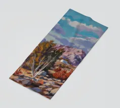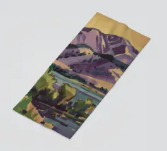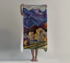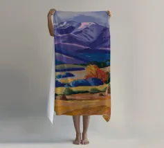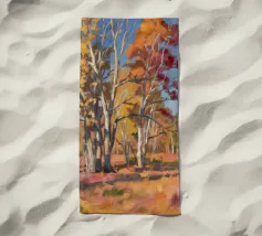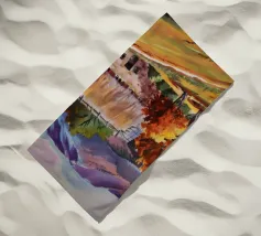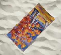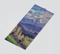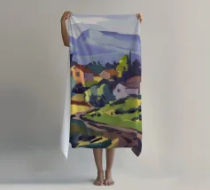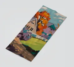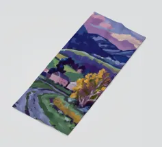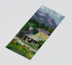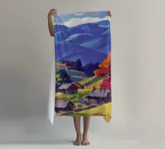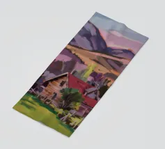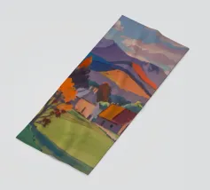 Un pittoresco paesaggio autunnale che raffigura un villaggio o una fattoria adagiata su una collina, circondata da un mosaico di alberi colorati nei toni dell'arancione e del giallo e da campi coltivati, con le lontane montagne blu a completare la scena.