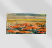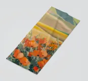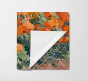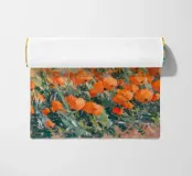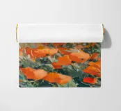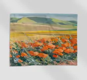 Un campo di papaveri arancioni crea un brillante patchwork di colori su dolci colline verdi e dorate, rese in modo stilizzato e moderno che enfatizza la gioia del paesaggio.