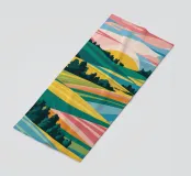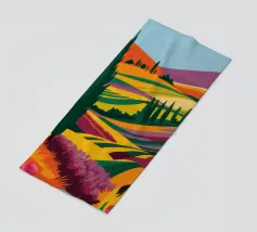 Un dipinto paesaggistico espressivo e vibrante di campi ondulati, simili a patchwork, nei toni del verde, del giallo e del rosa. Lo stile pittorico cattura la bellezza dinamica e la consistenza della campagna.