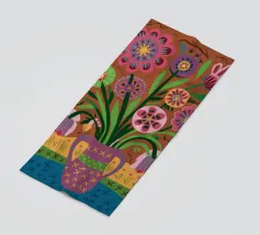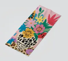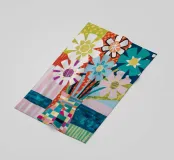 A vibrant bouquet of colorful flowers is arranged in a vase decorated with a patchwork of different patterns, creating a unique and artistic floral still life.
