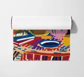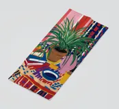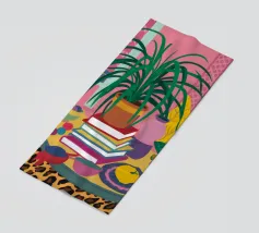 A still life of a potted plant and other objects on a table with a colorful, patterned rug underneath. The composition against a pink wall is modern, eclectic, and full of charming, decorative detail.