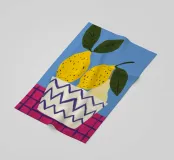 Una moderna natura morta di due pere gialle in una ciotola con un audace motivo a zig zag in bianco e nero. Lo sfondo a scacchi rosa e viola aggiunge un ulteriore livello di grafica giocosa alla composizione.