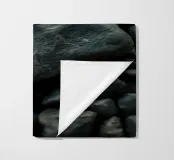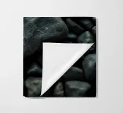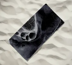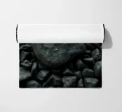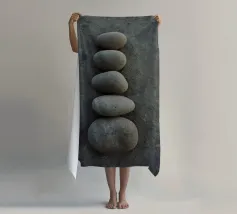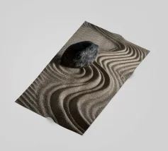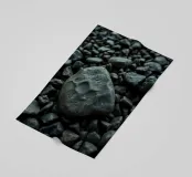Rocce di varie forme e dimensioni sono adagiate su una spiaggia, con un'attenzione particolare a una pietra unica e strutturata. L'ambiente appare tranquillo, con la luce del crepuscolo che mette in risalto il paesaggio naturale.