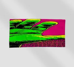 Illustrazione a fumetti colorata e dettagliata di una mano di zombie con vivaci tonalità verdi e viola, texture gocciolanti e dito indice esteso. La mano è collocata su uno sfondo verde brillante per un effetto spettrale.