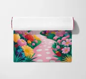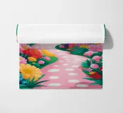 A whimsical landscape featuring a pink, polka-dotted path winding through a fantasy world of stylized cacti and hills under a pastel sky.