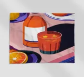 A poolside table features oranges, a bottle of juice, and a glass, surrounded by serene water and a relaxing atmosphere. The vibrant setup exudes freshness and tranquility.