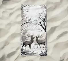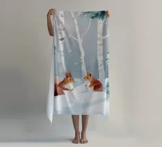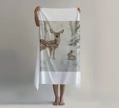 Idilliaco poster invernale con due conigli seduti in una foresta innevata. I fiocchi di neve che cadono dolcemente e i maestosi abeti creano un'atmosfera tranquilla e fiabesca. Questo murale combina motivi animali e natura invernale ed è perfetto per decorare il soggiorno, la camera da letto o la stanza dei bambini. Un'opera d'arte che porta la pace, l'intimità e la magia dell'inverno in ogni casa, ideale per gli amanti degli animali e della natura.