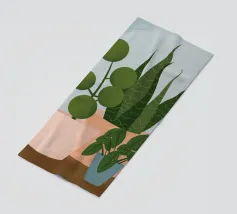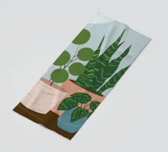 Su uno sfondo chiaro è raffigurata una serie di piante d'appartamento in vasi colorati e a fantasia. Le piante variano per dimensioni e forma delle foglie, creando un'affascinante scena di giardino interno.