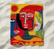 A powerful and raw abstract portrait of three faces, rendered in bold, primary colors of red and blue with black outlines, conveying a primal, cubist energy.