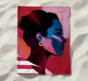 A stylized portrait of a woman in profile, with blue highlights on her dark skin and hair, wearing an earring. The background is dark red with white striped or starred elements, evoking a starlight effect.