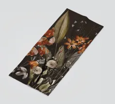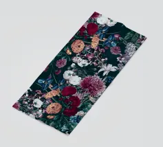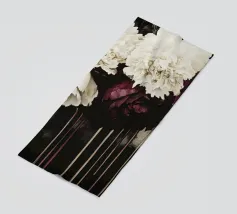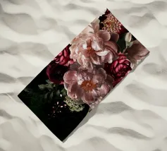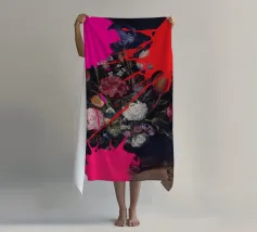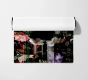 Un bouquet delicato con un tocco dark. Questa opera d'arte rivela un teschio formato interamente da fiori e fogliame lussureggianti, che galleggia su uno sfondo nero profondo. Bande verticali di colore verde neon, rosa arrossato, crema e bianco attraversano l'opera come glitch digitali, squarciando i fiori e conferendo al disegno un'atmosfera moderna, quasi olografica.