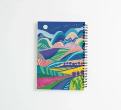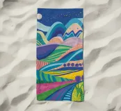 Un paesaggio vibrante e psichedelico di colline ondulate in un tripudio di colori, sotto un cielo notturno stellato. La composizione è una rappresentazione onirica, energica e fantasiosa di un mondo fantastico.