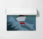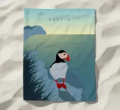Ein minimalistisches Reise-Design mit einem süßen Puffin bzw. Papageientaucher an Islands Küstenlandschaft.