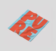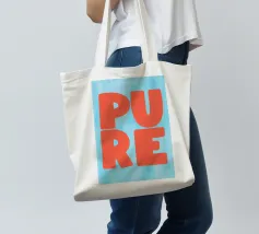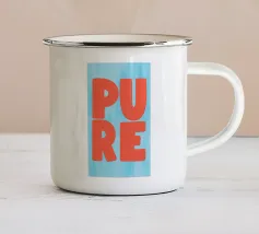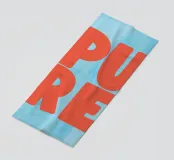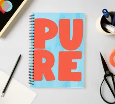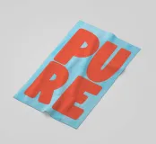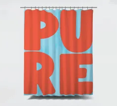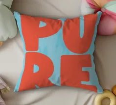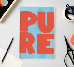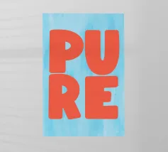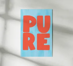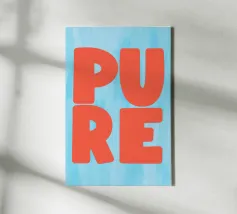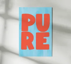 PURE: Privo di qualsiasi contaminazione; genuino e incontaminato. Una stampa tipografica sorprendente ed energica con la parola "PURE" in un font giocoso e sovradimensionato di colore rosso-arancio. Su uno sfondo blu cielo materico e pittorico, questo pezzo contemporaneo conferisce un senso di freschezza e uno stile scandinavo moderno a una vivace parete della galleria o a uno spazio abitativo.