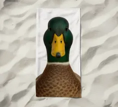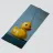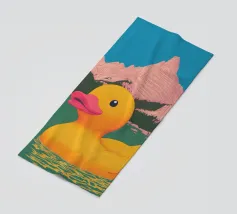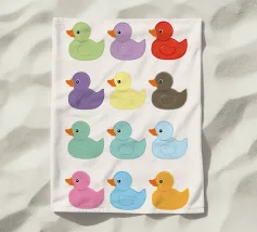 Un'illustrazione altamente dettagliata e realistica di un'anatra di gomma gialla brillante seduta su un morbido sfondo blu. La finitura lucida e i colori vivaci evidenziano il suo carattere allegro e giocoso.