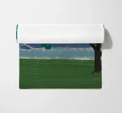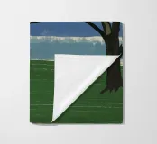 Un albero solitario con ampie foglie verdi si staglia in primo piano su uno sfondo con sfumature di blu, che suggerisce colline o montagne lontane. Il campo è di un verde intenso, con pennellate visibili dappertutto, e il cielo ha una tonalità beige, che conferisce alla scena una qualità semplicistica, quasi infantile.