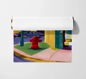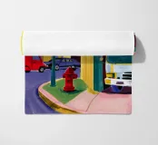 Un idrante rosso vivo e una cassetta postale si trovano all'angolo della città, con i loro colori brillanti che risaltano sugli edifici stilizzati e sulla strada, una celebrazione dei dettagli urbani.