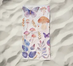 Illustrazione carina di funghi rossi, farfalle, fiori e piante botaniche con nome
