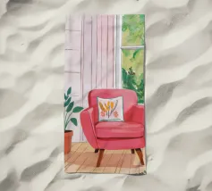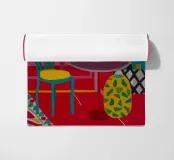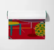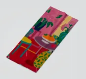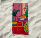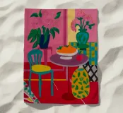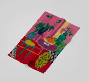 A cozy and colorful interior scene of a small round table with two chairs, a vase of flowers, and a potted plant. The vibrant reds, pinks, and greens create an inviting and intimate atmosphere.