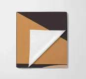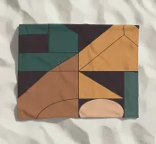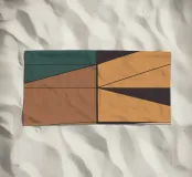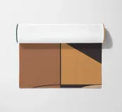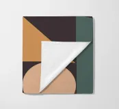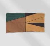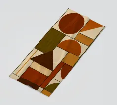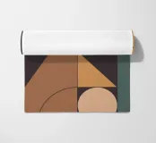 Un'opera d'arte astratta con forme geometriche nei toni dell'arancio, del verde e del beige, incorniciata da un bordo morbido su uno sfondo scuro.