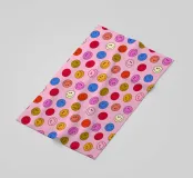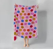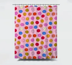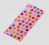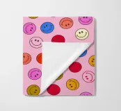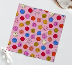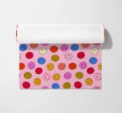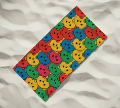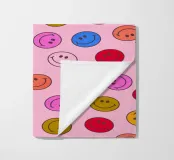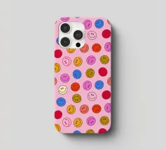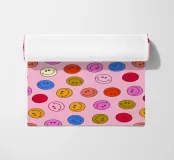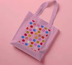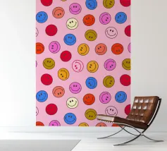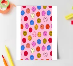 Diffondete l'allegria con questo vivace disegno senza cuciture di faccine sorridenti. Il disegno divertente e giocoso presenta una serie di faccine sorridenti in un mix di colori brillanti e neon su uno sfondo rosa tenue. Questo motivo ripetuto di ispirazione retrò è perfetto per aggiungere un tocco di allegria a qualsiasi progetto. Da showmemars