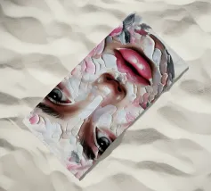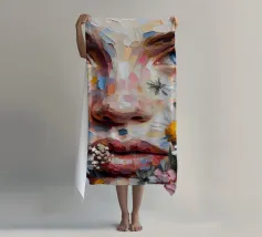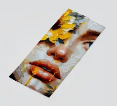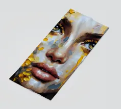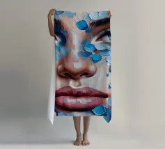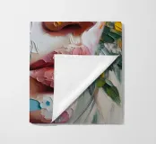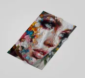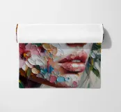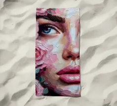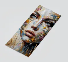 Portrait painting of female with colourful flowers and petals on her face.