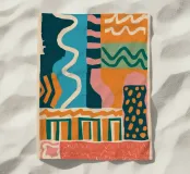 A vertical abstract composition with a cascade of colorful, rhythmic shapes and patterns, including waves, grids, and organic forms, in a palette of orange, blue, and teal.