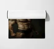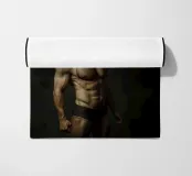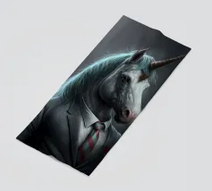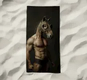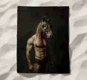 Un ritratto surreale con un uomo muscoloso che indossa una dettagliata maschera da cavallo, in posa su uno sfondo scuro e lunatico. La combinazione di tratti umani e animali crea un concetto visivo stimolante e fantasioso.