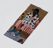 Questa opera d'arte mostra una persona seduta su una sedia a righe, circondata da girasoli e da una borsa verde. Lo sfondo è di un marrone tenue che crea un'atmosfera rustica e riflessiva.