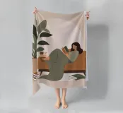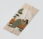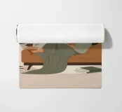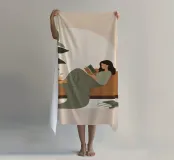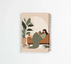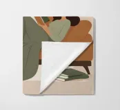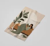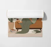 Una composizione minimalista con una donna comodamente sdraiata con un libro e una tazza di tè. La miscela di verdi e marroni tenui evoca relax, equilibrio e calore: un invito a rilassarsi e a riconnettersi con le semplici gioie della casa.