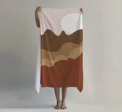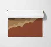Sfumature stratificate di marrone e beige creano un paesaggio stilizzato con un grande sole o una luna che sorge sullo sfondo. Le linee curve suggeriscono colline o montagne, evocando una scena desertica serena e astratta.