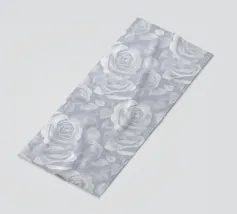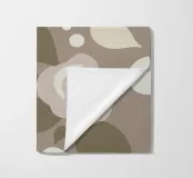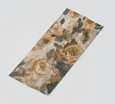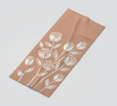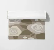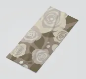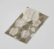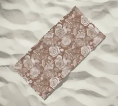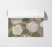 An illustration of a repeating pattern featuring rose flowers in various sizes and neutral colors, surrounded by brown leaves and dotted accents.