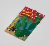A vibrant collection of stylized cacti in colorful pots is set against a bold red background featuring a whimsical pattern of lights or beads, creating a playful and modern botanical composition.