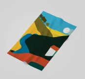 Vivid colors divide the scenery into stylized shapes that depict a hilly landscape with a blue river winding through it. A house is nestled against the shadow of a large hill, with the bright sun hanging in the sky above.