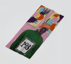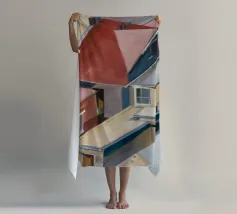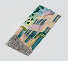 Una complessa scena urbana è resa con un'attenzione particolare alle forme geometriche e a un'audace tavolozza di colori rosa, verde acqua e rosso. Una scala esterna fornisce un forte elemento compositivo, guidando l'occhio attraverso le forme architettoniche astratte.