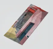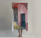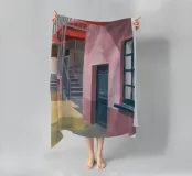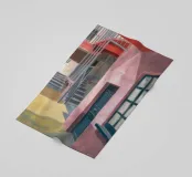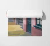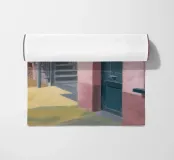 Una complessa scena urbana è resa con un'attenzione particolare alle forme geometriche e a un'audace tavolozza di colori rosa, verde acqua e rosso. Una scala esterna fornisce un forte elemento compositivo, guidando l'occhio attraverso le forme architettoniche astratte.