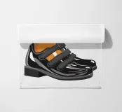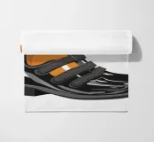 Una dichiarazione di moda moderna e stravagante catturata in un'illustrazione di un singolo sandalo nero indossato con un calzino arancione brillante. La composizione è un'interpretazione audace, giocosa e contemporanea della moda "ugly chic".