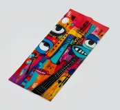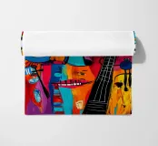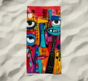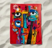 Un dipinto astratto audace e colorato con un volto surreale composto da occhi espressivi, tratti esagerati e strumenti musicali. Le pennellate dinamiche e la tavolozza vivida creano una composizione sorprendente ed energica.
