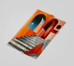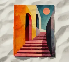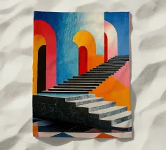 Uno spazio architettonico astratto è definito da una scalinata spoglia e da archi sovrapposti, con un drammatico gioco di luci e ombre che crea una composizione potente e minimalista.