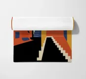 Primo piano astratto e minimalista di una forma architettonica, con una scala bianca e spoglia su una parete arancione con una finestra circolare nera e ombre profonde.