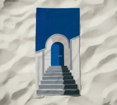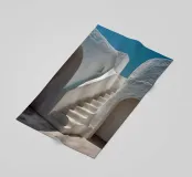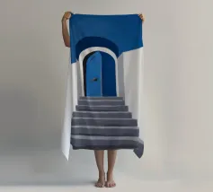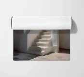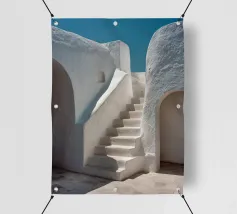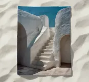 Scala bianca scolpita con curve organiche e pareti strutturate, immersa nella luce sotto un cielo blu intenso, in uno stile mediterraneo minimalista. Una tavolozza di luce bianca e azzurra, ideale per un arredamento contemporaneo, raffinato e architettonico. Perfetta per un soggiorno, una camera da letto o un ufficio creativo, per creare un'atmosfera estiva calma e stimolante.