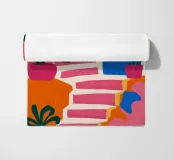 Un'illustrazione astratta mostra una scala colorata adornata da una varietà di piante in vaso, fondendo architettura e botanica in una composizione vivace e moderna.