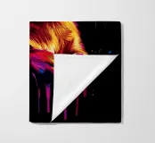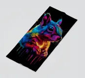 Uno scoiattolo curioso si affaccia vivacemente dal quadro, raffigurato con colori intensi e brillanti su uno sfondo nero. La tavolozza dei colori spazia dal blu intenso e dal rosa brillante al giallo caldo e al rosso vibrante. I passaggi sono fluidi e ricordano le pennellate, mentre singoli schizzi e gocce di colore conferiscono al motivo un effetto dinamico, quasi esplosivo. L'animale appare vigile e vivace, con dettagli finemente lavorati nella sua pelliccia e un grande occhio lucido che guarda direttamente lo spettatore.