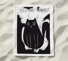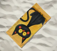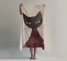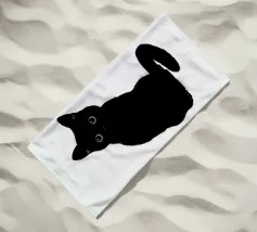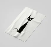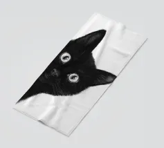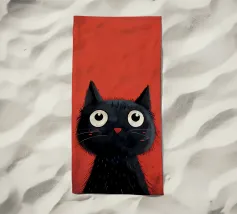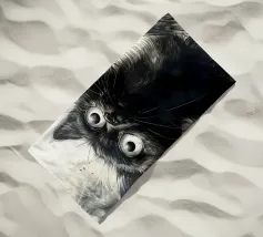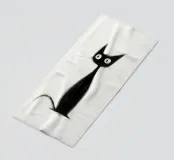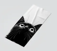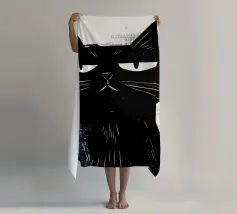 Illustrazione minimalista in bianco e nero di un elegante gatto nero con occhi esageratamente grandi e lineamenti abbozzati. Il disegno astratto e stravagante del gatto aggiunge un tocco artistico e giocoso.