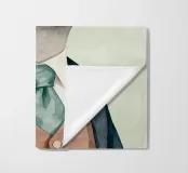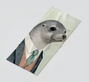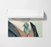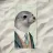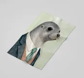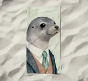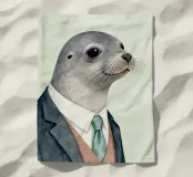 Ritratto realistico ad acquerello di una foca aggraziata vestita con un abito scuro, un gilet color ruggine e una cravatta a righe verde acqua su un morbido sfondo color menta pastello.