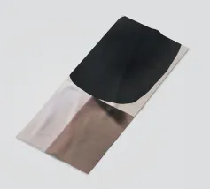Una grande forma nera irregolare è posizionata al centro su uno sfondo più chiaro a contrasto, dall'aspetto ruvido e strappato. Il design è minimalista, con un'atmosfera astratta e una tavolozza di colori semplice.