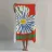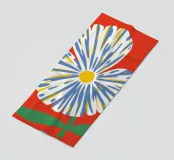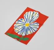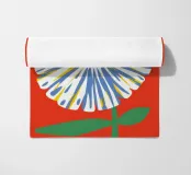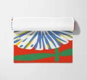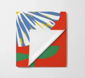 Un'illustrazione audace e grafica di un singolo grande fiore, probabilmente un anemone, con petali a strisce bianche e blu e un centro giallo. Lo sfondo rosso brillante rende il fiore il fulcro assoluto di questo pezzo potente.