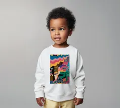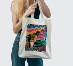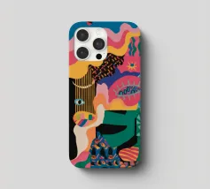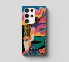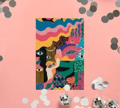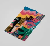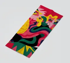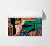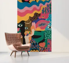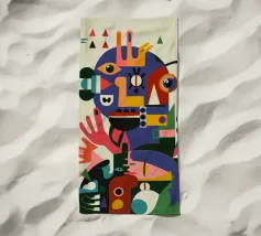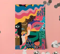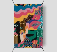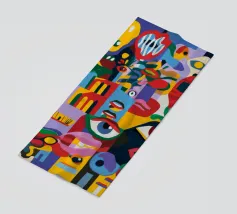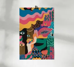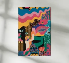 Un'opera accattivante che fonde figure umane con motivi astratti e colori vivaci. Volti e occhi sono sottilmente integrati nelle forme organiche, evocando un senso di antica saggezza e di connessione primordiale in un paesaggio surreale.
